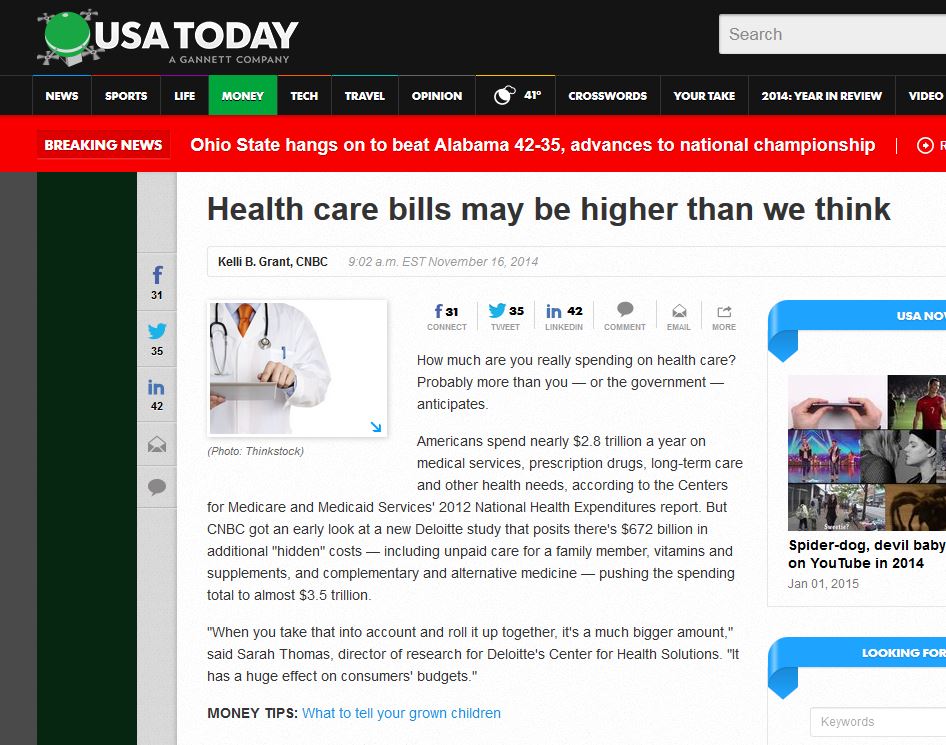 The story notes that Americans spend nearly $2.8 trillion a year on medical services, prescription drugs, long-term care and other health needs, according to the Centers for Medicare and Medicaid Services’ 2012 National Health Expenditures report.